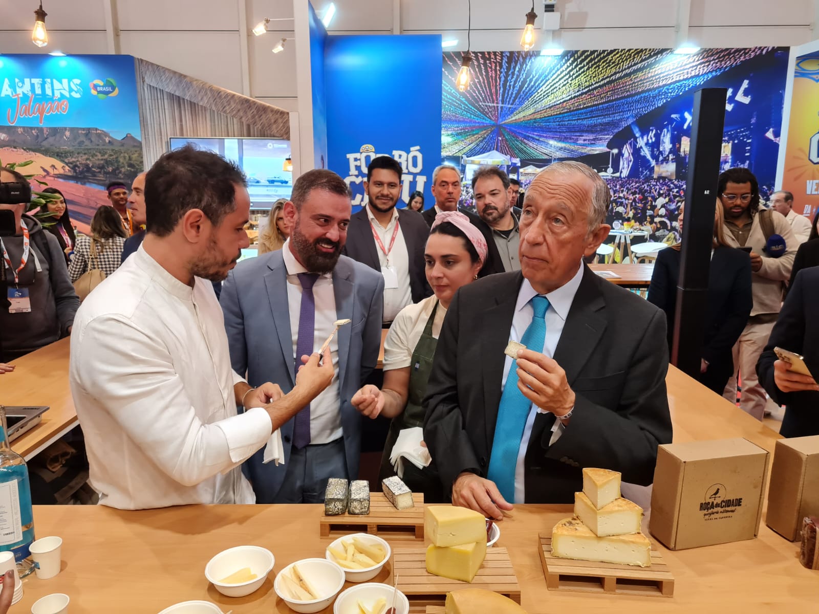 Presidente de Portugal visita estande, degusta queijos e diz que a comida mineira é um sonho